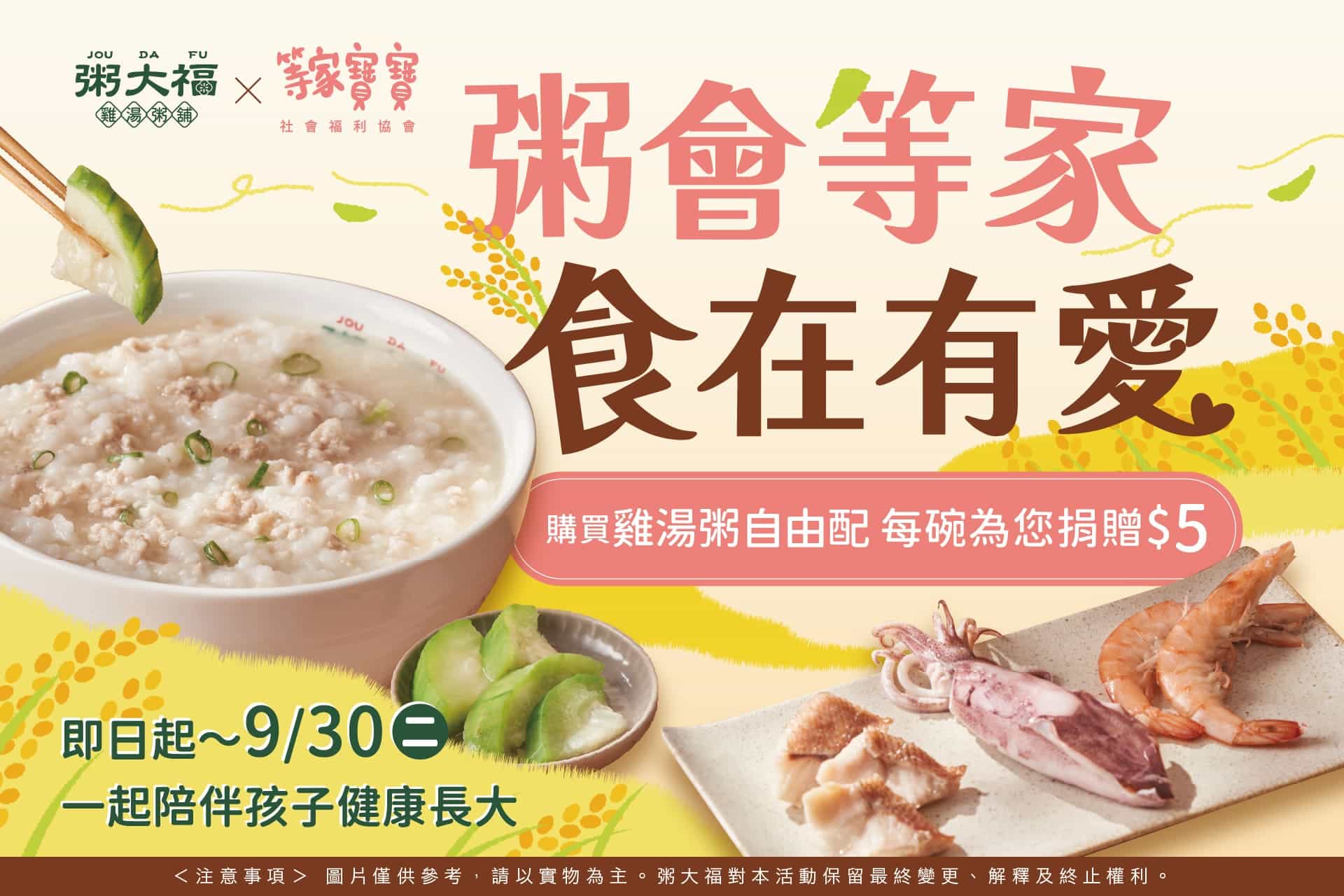 台灣連鎖雞湯粥第一品牌「粥大福」攜手「等家寶寶社會福利協會」,共同推動「粥會等家.食在有愛」公益計畫。